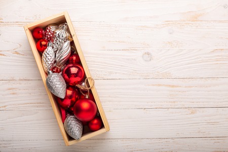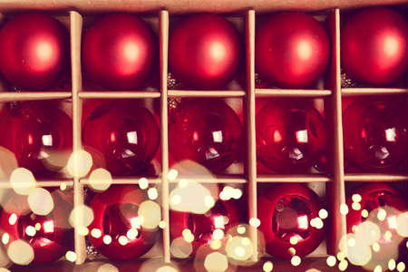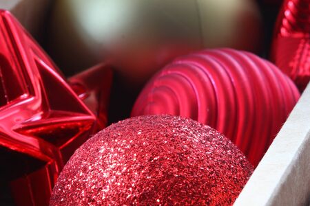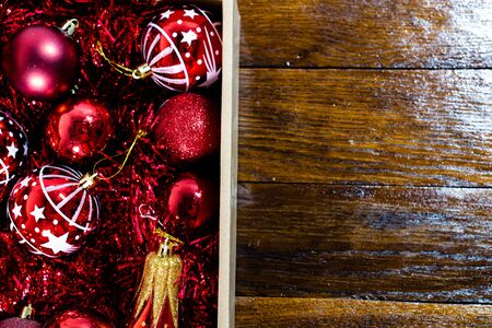 Christmas decorations in a box. Christmas concept. Box with red Christmas balls and garlands.
