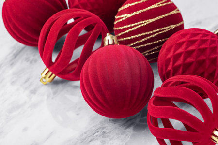 Red Christmas ball decorations, velvet baubles on marble table background, closeup