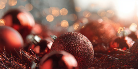 Red ornaments and tinsel arranged for holiday decoration in a warm setting