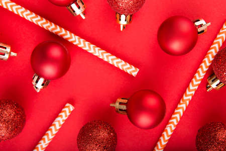 Red Christmas balls on a red background with striped straws for a cocktail.