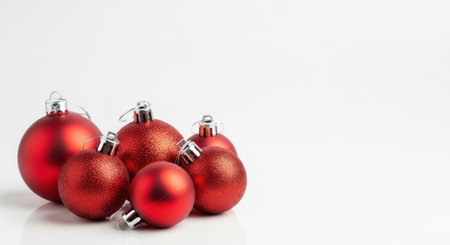 A collection of shiny red Christmas ornaments of various sizes, arranged on a clean white surface, providing ample copy space for festive designs or text.