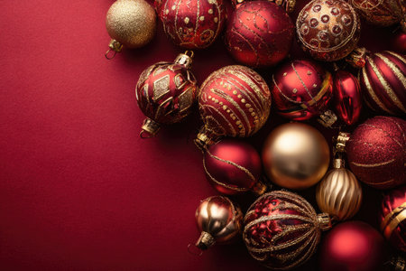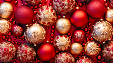 An overhead shot presents an arrangement of red and gold Christmas ornaments against a deep red surface. The scene showcases diverse textures and intricate patterns across the ornaments, illuminated by soft lighting. The image evokes a celebratory atmosphere and is suitable for various commercial projects related to holidays and decorations.