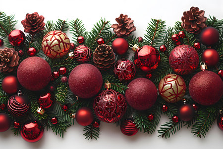 A beautifully arranged collection of red christmas ornaments and pine cones nestled in lush green pine branches. the festive setup exudes holiday warmth and cheer, perfect for seasonal decor or design purposes. Generative AI
