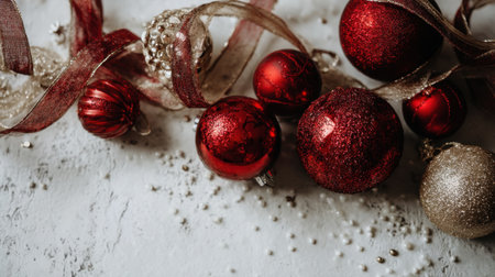 A stunning arrangement of red and gold Christmas ornaments paired with elegant ribbons laid on a textured background, perfect for holiday themes and decoration inspiration.