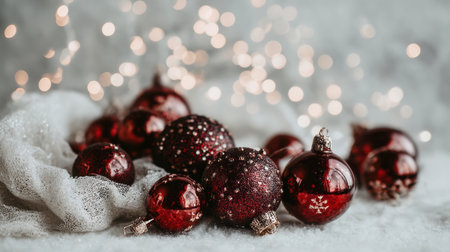 A beautiful arrangement of red Christmas ornaments resting on soft fabric, surrounded by blurred twinkling lights, creating an inviting and festive holiday atmosphere.