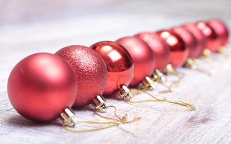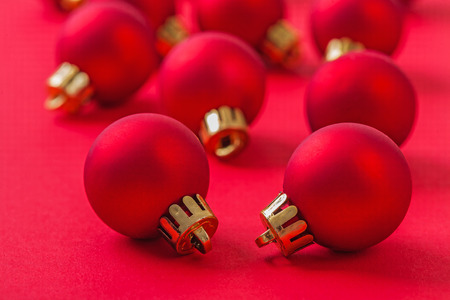 Monochrome red christmas lifestyle - rows of glass bables, toned