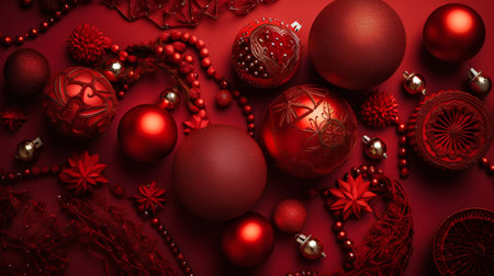 Group of decorative red christmas ornaments background, forming festive seasonal background. Perfect for greeting cards or holiday promotions.