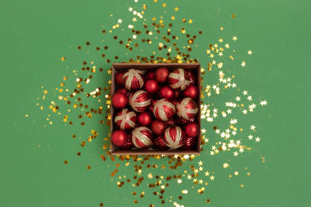 Box with red Christmas toys on a green background. Festive shiny composition with golden stars confetti.
