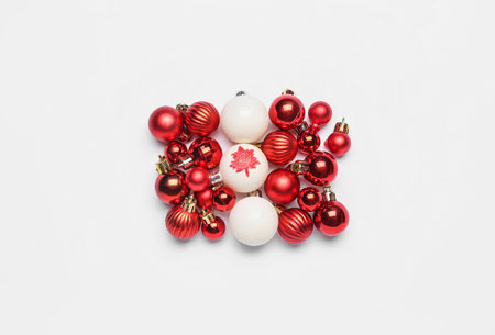 Christmas balls with drawn maple leaf on white background. Canadian flag concept