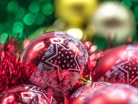 Beautiful red Christmas balls decorated with gold on black background with bokeh, close-up, selective focus. New Year, holiday, decoration, December, invitation, abstraction, poster, symbol concept