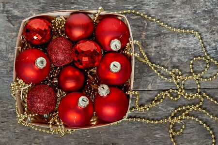 Christmas balls red and gold, beads lie in a wooden basket top view of vintage style.