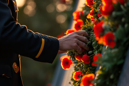 A soldier's hand placing a wreath decorated with red poppies on a memorial during a Veterans Day ceremony, illuminated by the soft glow of sunset.