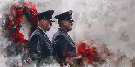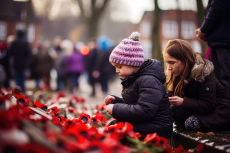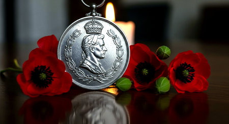 A tranquil cemetery scene at dusk featuring a weathered stone adorned with vibrant red poppies and a solemn memorial ribbon, evoking remembrance and s