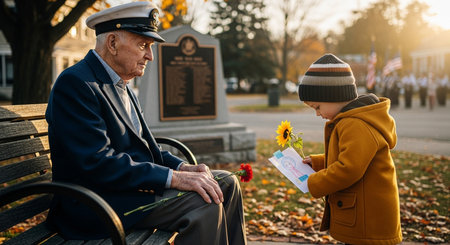 Little boy giving flower to senior veteran sitting on park bench. Autumn scenery with american flags. Day of remembrance and honor.