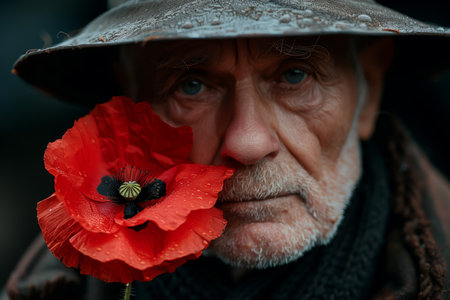 Elderly Man Holding a Red Poppy Flower in Rainy Weather Outdoors