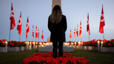 Solemn scene of a woman paying her respects at a war memorial, surrounded by flags and poppies