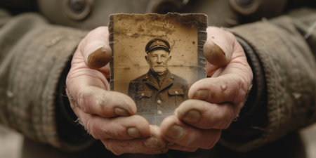 An older man in camouflage gently holds a vintage photo of a military figure, evoking themes of remembrance, loss, and the passage of time, captured in somber, low lighting.