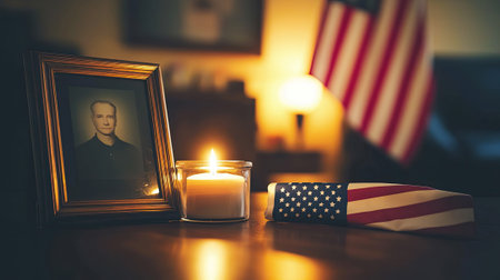 Close-up of a black ribbon resting on a memorial photo frame, surrounded by personal photographs, creating a serene atmosphere of remembrance and loss