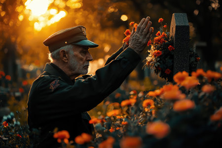 Veteran in uniform pays respect at a grave decorated with flowers in a cemetery at sunset
