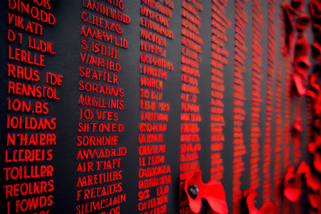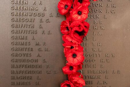 Canberra, ACT, Australia - Sept 1 2018: poppy decoration next to the wall of fallen soldiers at the Australian War Memorial - Lest we forget, Remembrance of war losses.