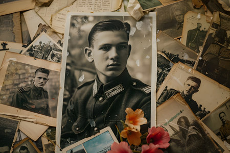 A person examines an old portrait in a collection of vintage photographs, surrounded by aged images and memorabilia, evoking nostalgia and curiosity about the past.