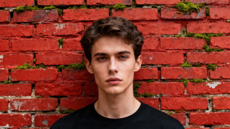 Detailed of a serious young man with thick, dark, wavy hair and intense eyes, framed against a weathered, high-contrast red brick wall where patches of bright green moss are thriving.