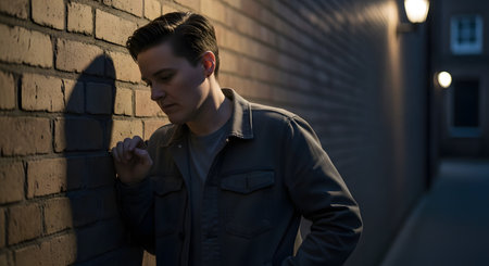 A person leaning against a brick wall in a dimly lit alleyway at night, looking down with a pensive expression. The dramatic street lighting creates a moody and cinematic atmosphere, suggesting solitude or deep thought.
