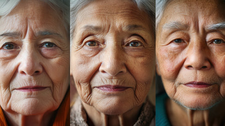 Row of diverse senior citizens close-up ai generated portrait image. Aged faces photography. Elderly friends with distinct expressions closeup picture photorealistic. Life stories concept photo