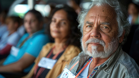 Diverse Group of People Smiling at an Event with Elderly Man in Foreground.