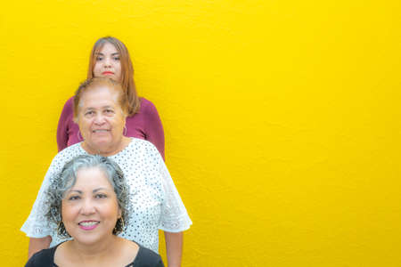 Three generations of latin Mexican women smiling in line, daughter, grandmother and granddaughter wearing casual clothes looking at the camera with a yellow background, space for text