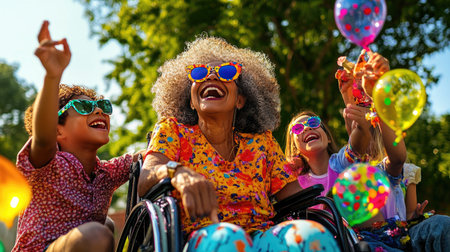 A heartwarming scene of an elderly woman in a wheelchair surrounded by joyful children, celebrating with colorful balloons on a sunny day.