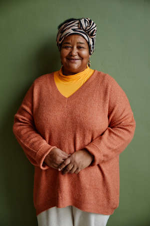Vertical portrait of black senior woman wearing ethnic prints and smiling at camera while standing against green background