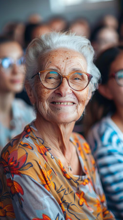 Elderly Caucasian woman smiling at a social gathering, featuring concepts of aging gracefully, senior social interaction, and positive aging. Vertical.