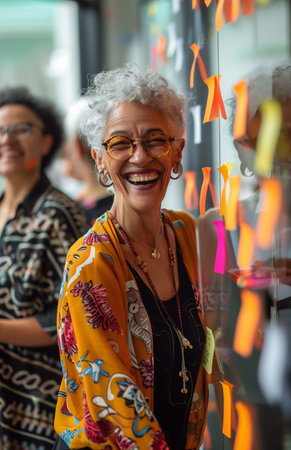 Women in their thirties and an older woman laughing, brainstorming around a glass board with notes