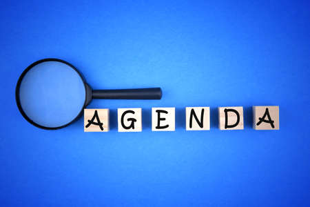 Magnifying glass with AGENDA wording on wooden block on blue background. Business concept.