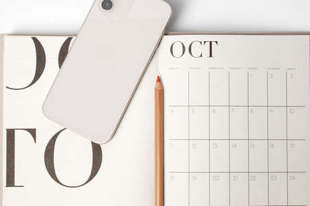 Monthly calendar, red pencil and modern smartphone on white background. October