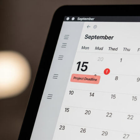 The image shows a digital calendar displayed on a tablet screen. The calendar is set to September, and a specific date, the 15th, is highlighted with a red exclamation mark and a label indicating it as a project deadline.