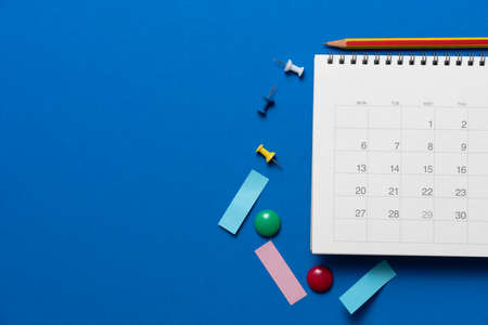 close up of calendar on the blue table background, planning for business meeting or travel planning concept