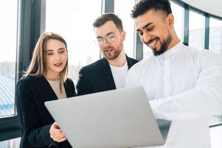 Cofident middle aged employer in suit standing between two young male and female subordinates in formalwear against interior of modern office