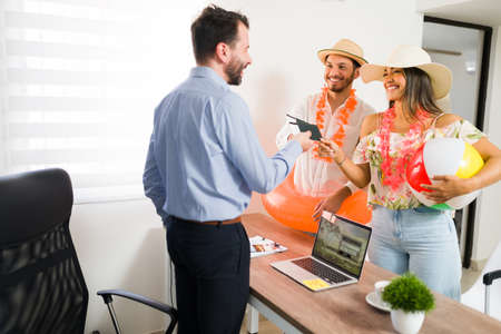 Couple of a happy married newlyweds arriving at the travel agency for their plane tickets to start their tropical vacation