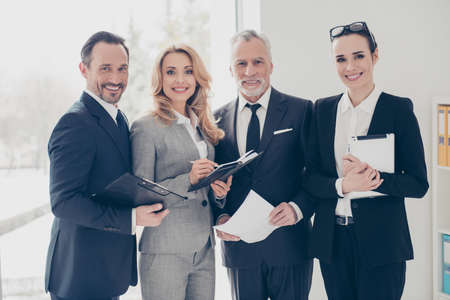 Portrait of four stylish, attractive, confident business people using, having gadget, paper, clipboard, dairy, organizer, standing in work place, station, looking at camera, wearing classic suits