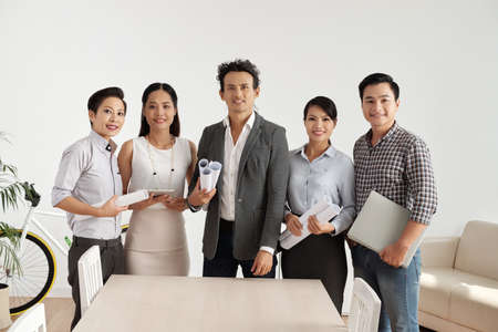 A portrait of a group of entrepreneurs in a modern office holding modern work equipment.