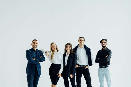 Teamwork and partnership. Portrait of diverse, friendly and successful business team standing in row on wall background. Men and women of all ages and nationalities work together on business projects.