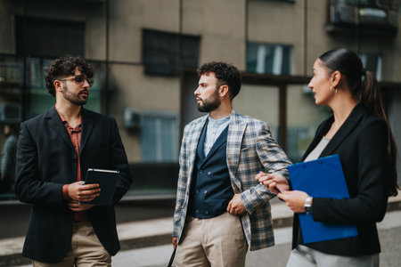 Young colleagues walk together on a city street, carrying folders and bags after a meeting