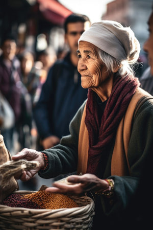 Elderly hispanic woman in traditional attire with embroidered hat and red shawl