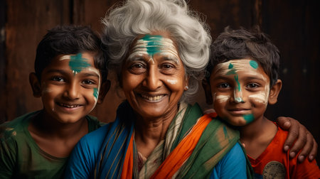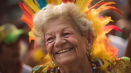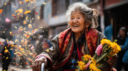 Smiling woman in vibrant traditional attire enjoying a cultural celebration in an uplifting atmosphere. Generative AI