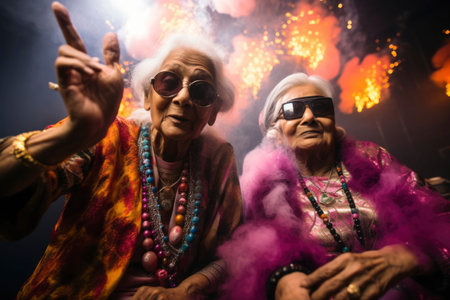 A group of elderly Mexican women dressed in colorful traditional clothing and floral crowns, seated together at a cultural event, reflecting pride and tradition, Hispanic Heritage Month.