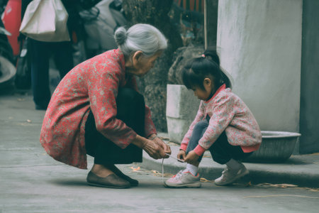Elderly woman tying shoelaces of her young granddaughter, teaching her how to do it on a city sidewalk