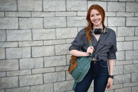 A redhead girl n a denim shirt with headphones on her neck and a backpack stands against a white stone wall and smiles broadly