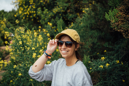 Portrait of a young hiker woman with a yellow cap smiling in the forest